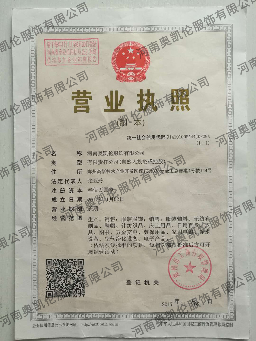 河南奥凯伦服饰有限公司始建于2005年,原名“郑州奥伦服装厂”是专业从事时尚西服,工装和校服的设计、生产、销售于一体的生产厂家。企业建立之初只为一线服装品牌代工生产,卓越的品质,周到的服务赢得了客户的肯定,也积累了丰富的经验。奥凯伦服饰与其他服装企业不同之处,在于对产品的要求相当苛刻。公司经过十多年的发展,现有厂房建筑面积15000多平方米,拥有先进的生产设备和专业的技术人才,年产能超100万套,已成为国内团体定制知名企业。产品以时尚为切入点,以“高起点,高档次”为经营发展战略,以“追求卓越,永无止境”为经营理念...